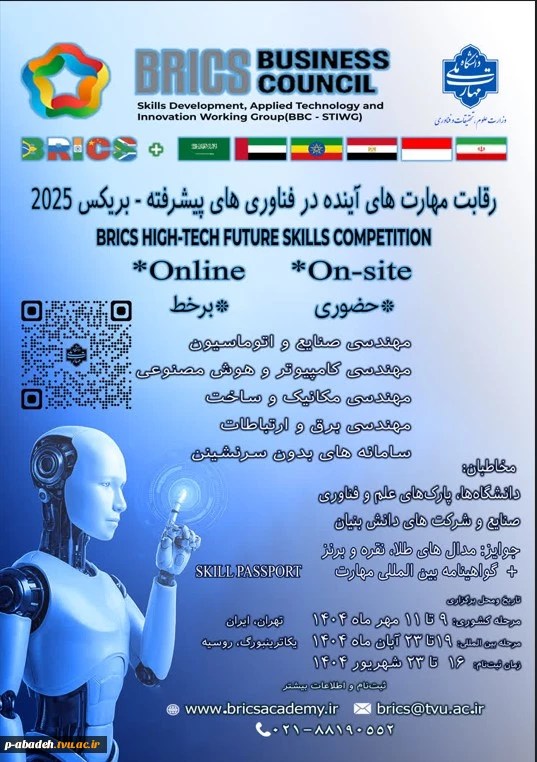 امتیاز دهید : فراخوان شرکت در مسابقات مهارت بریکس 2025 در تهران و مسکو 2 سهشنبه 18 شهریور 1404 ساعت 9:10